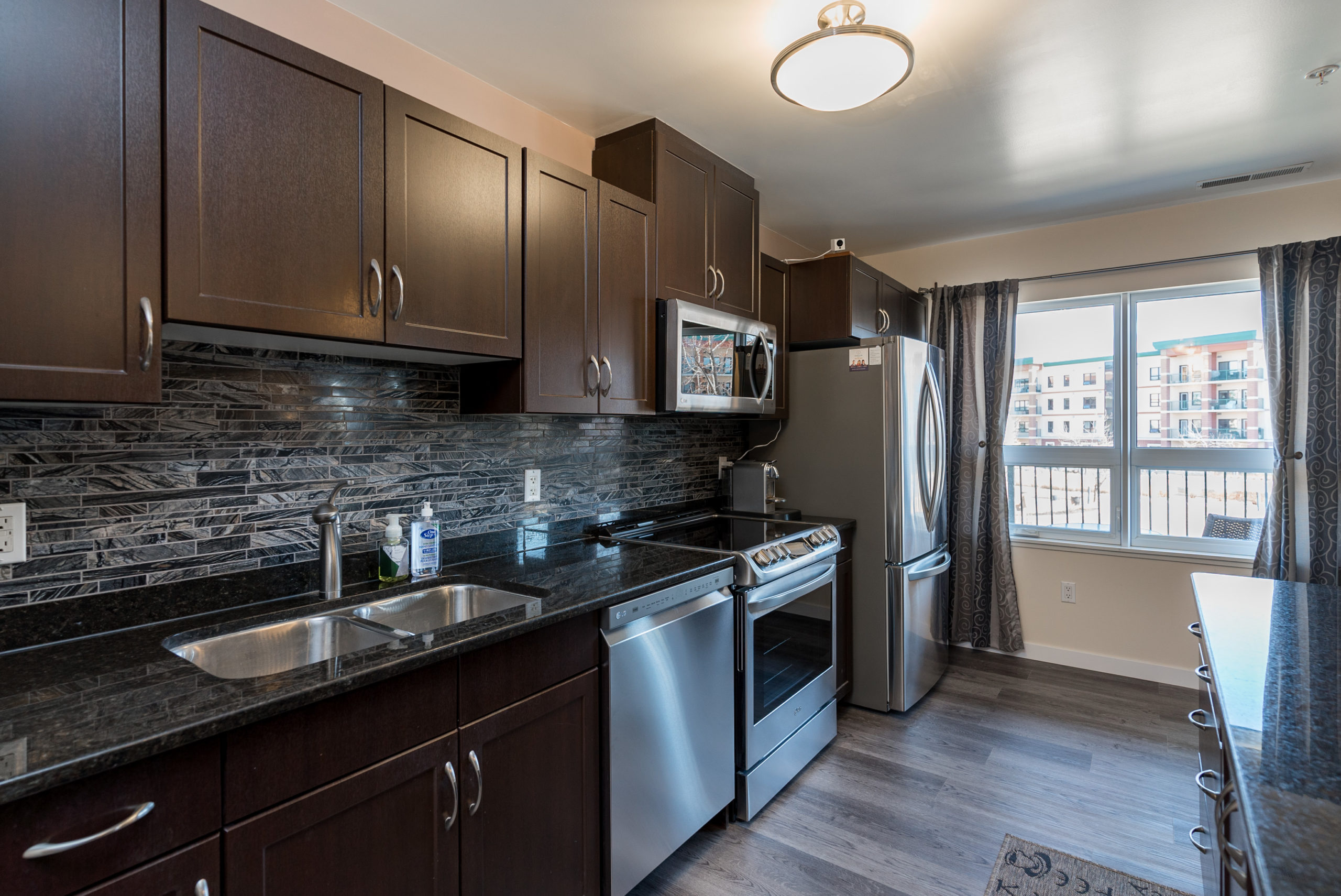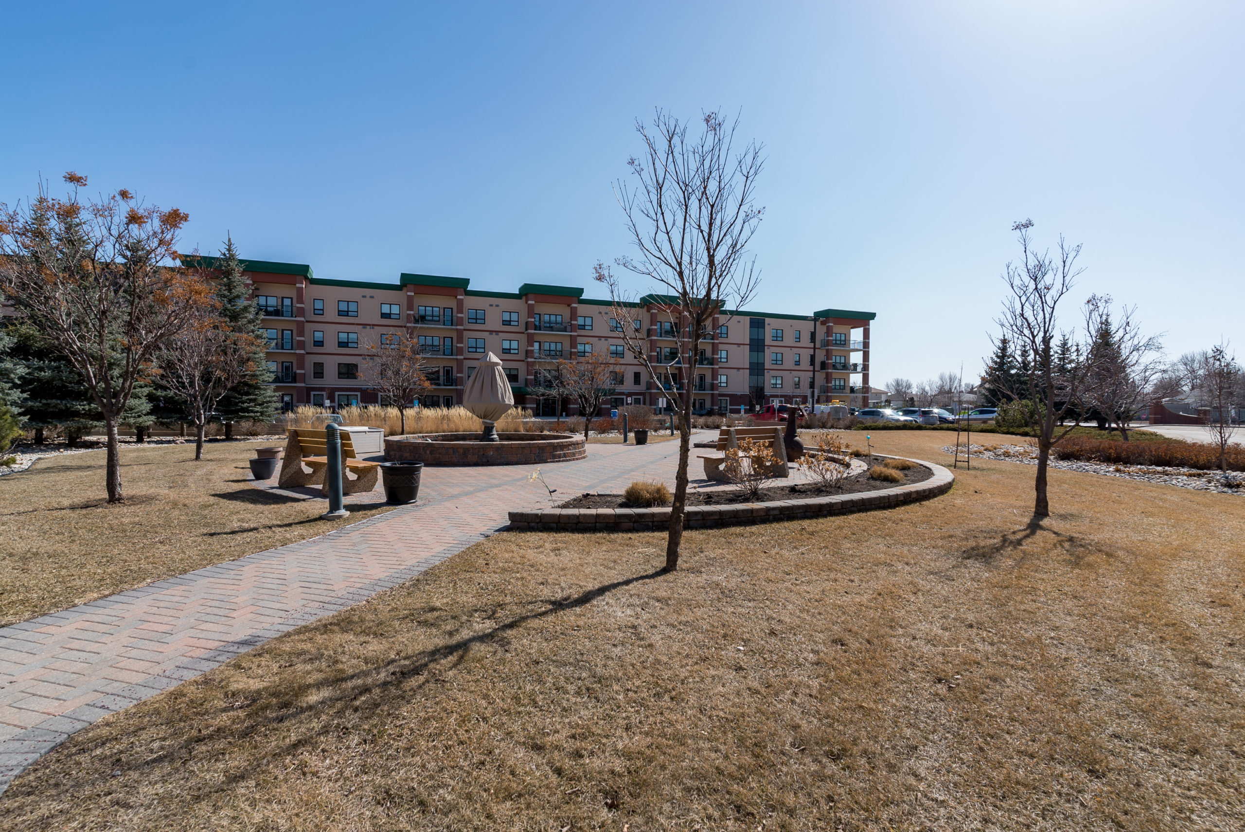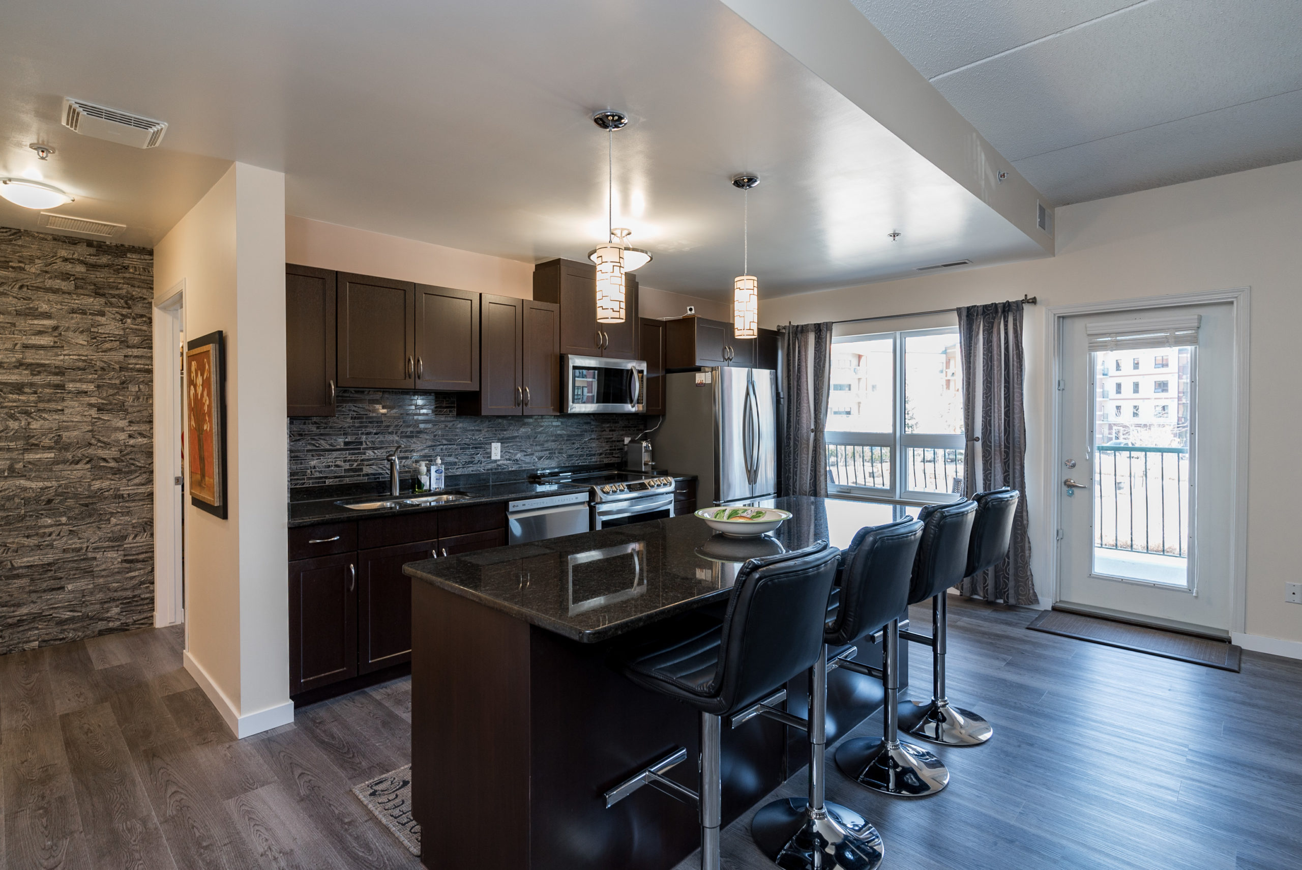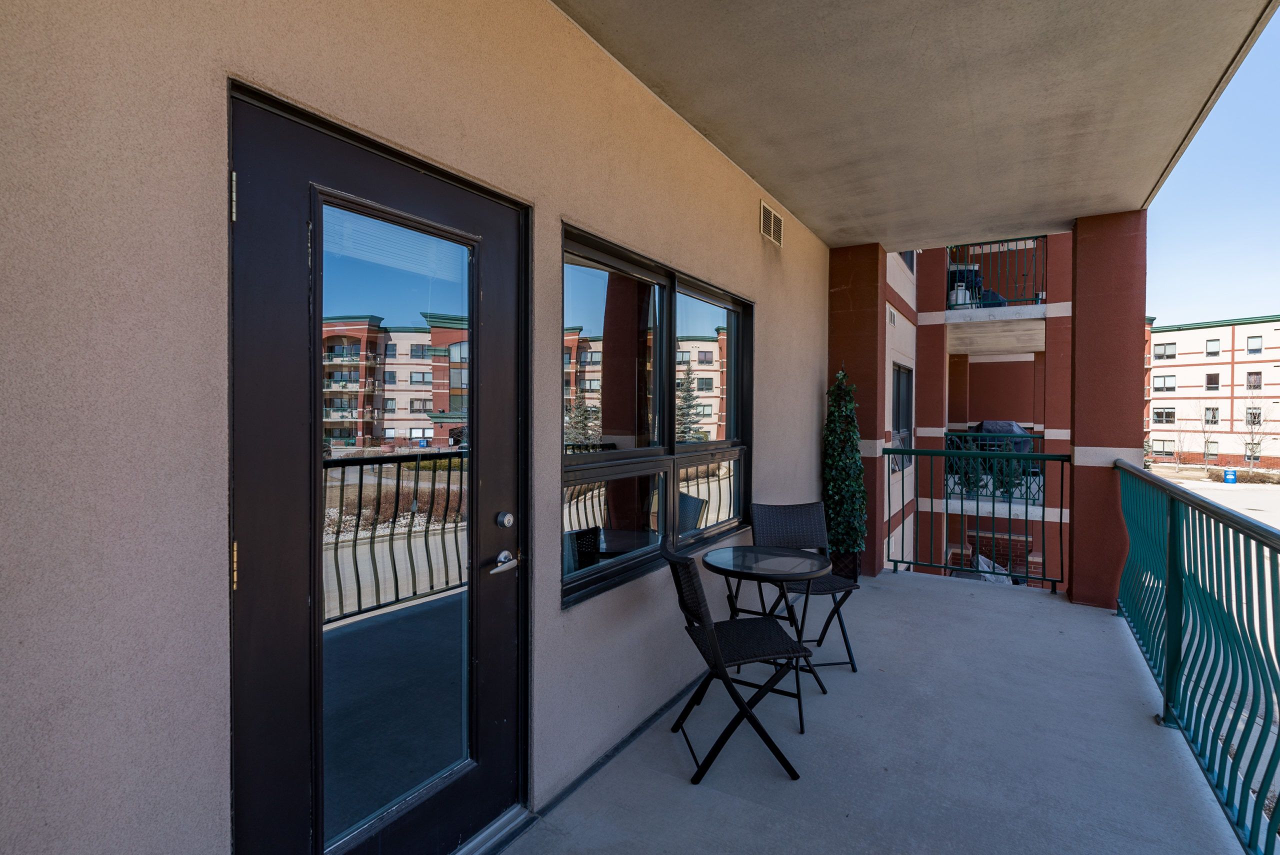 WOW FACTOR exhilarates the senses, upon entering – & there is so much to take in – & appreciate! Looking straight ahead, your eyes are thrust upon a balcony overlooking a beautiful piazza. Enjoy a glass of wine, or a good book in the summer & envision that you are in Rome. Beautiful architecture! Your eyes re-focus on this trendy & exciting 1076 sq ft “Masterpiece” featuring decor that could grace the cover of “Better Homes & Gardens” – one of two stone feature walls in the foyer, an open-concept design w/newer laminates, flowing through – complimenting the decor. Granite counters & stone backsplash, large island w/overhang & granite counter (rare/one piece), 4 SS APPLS, large windows allowing for an abundance of natural light, an exquisite LR & DR for soirées. A Primary suite w/walk-in CC & 4-PCE bath & 2nd 3-PCE & den. In-condo laundry (washer/dryer). Cent/air. The LARGEST 12 ft UNDERGROUND PARKING stall! VALUE – Utilities & MORE in condo fee. AMENITIES ABOUND!!
