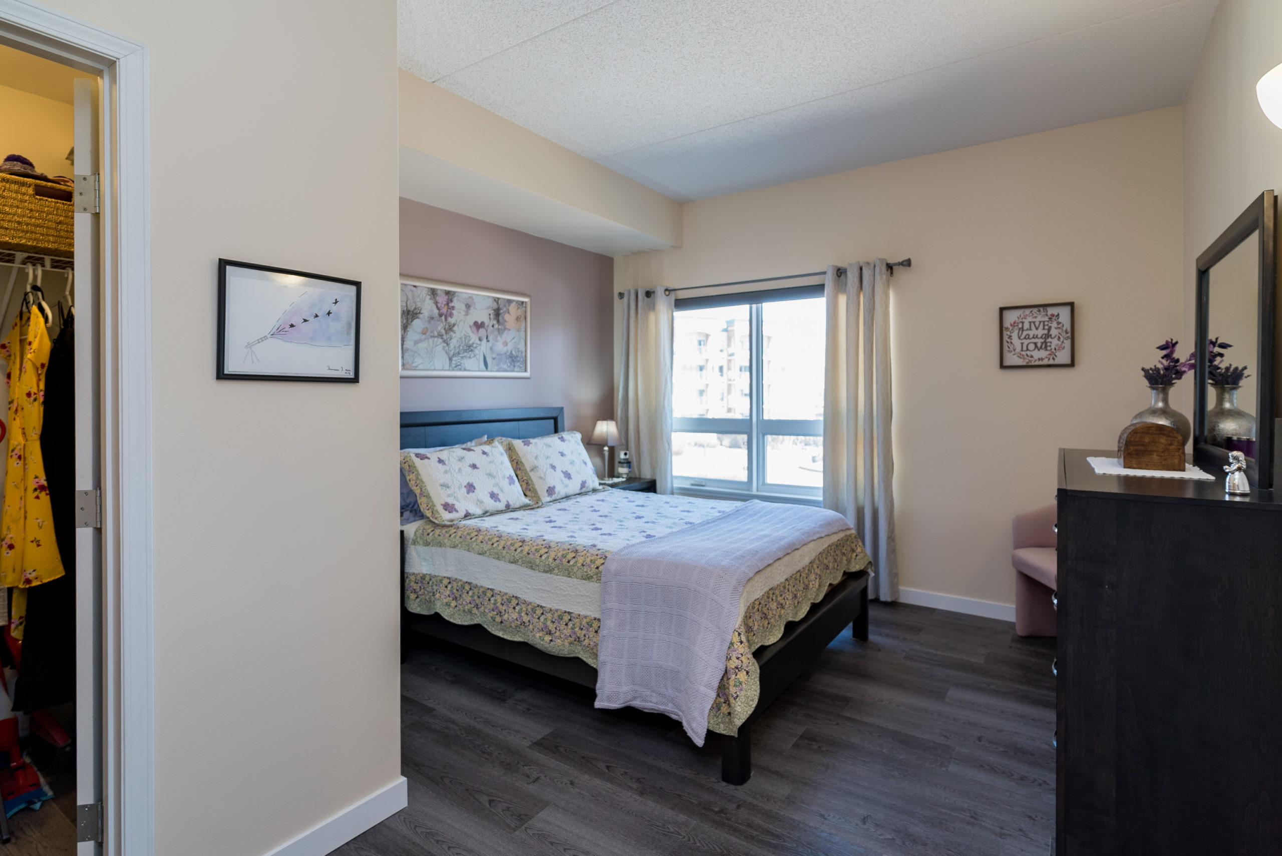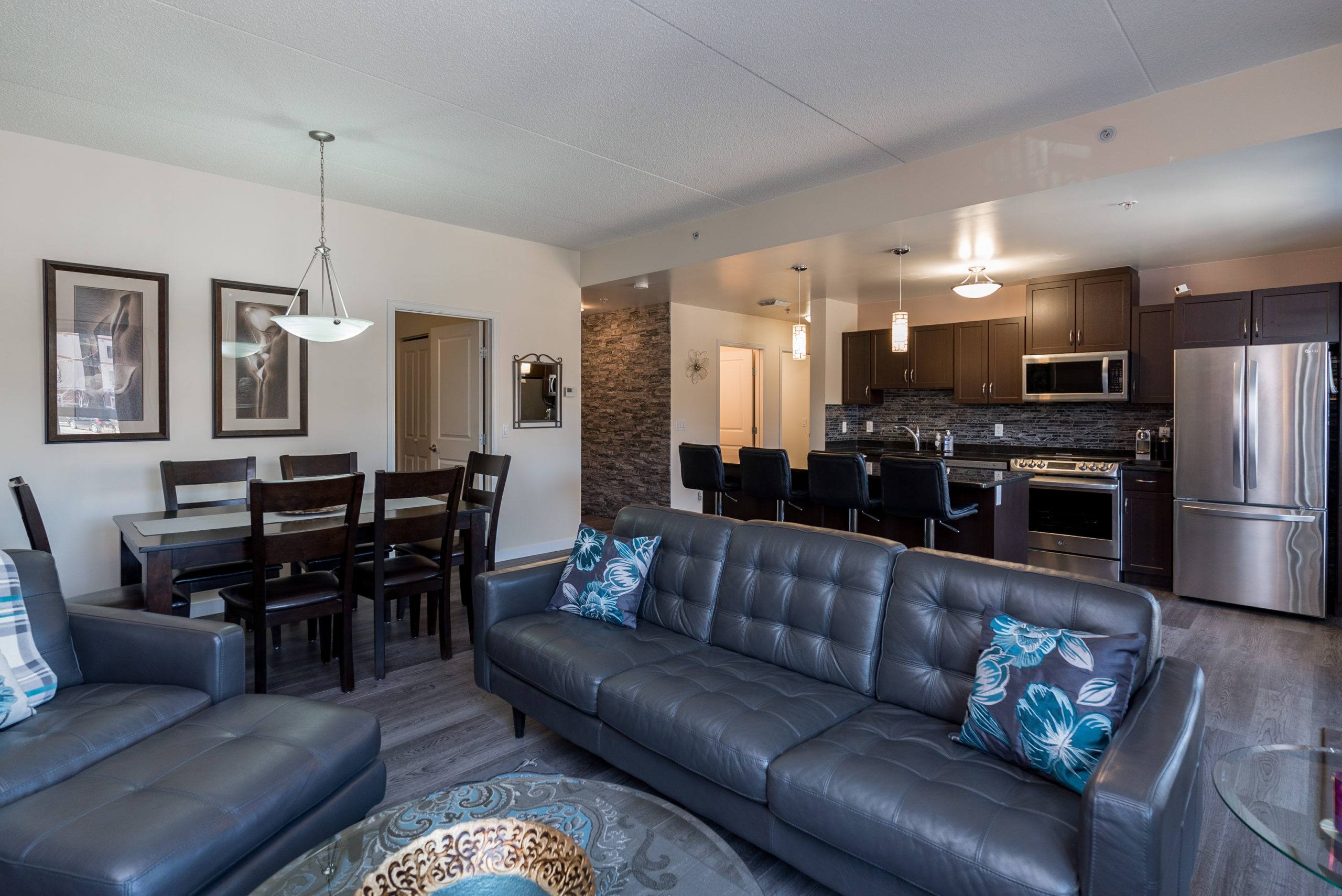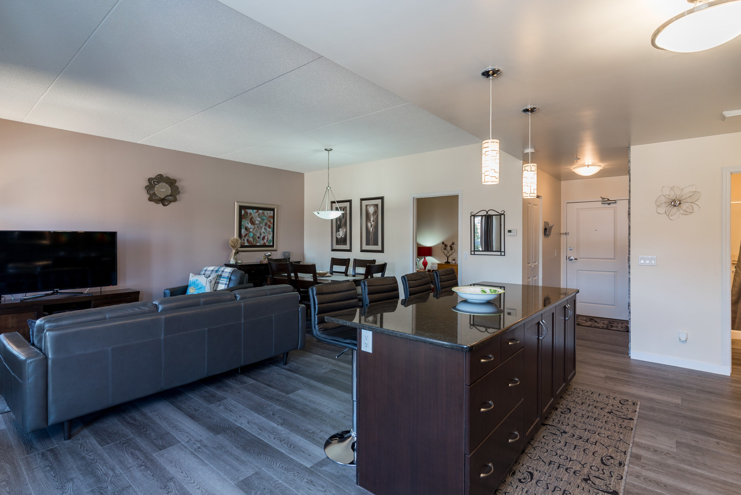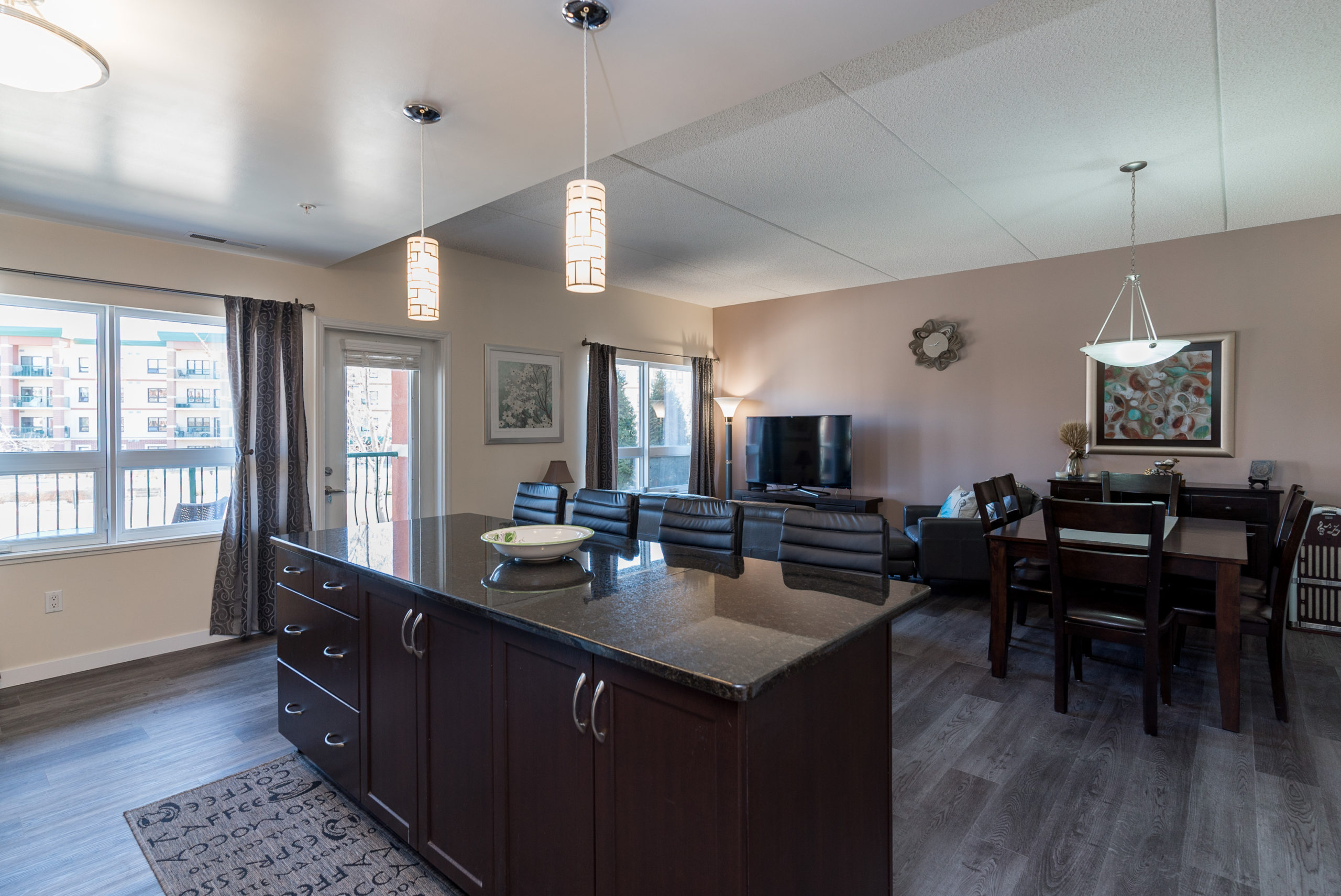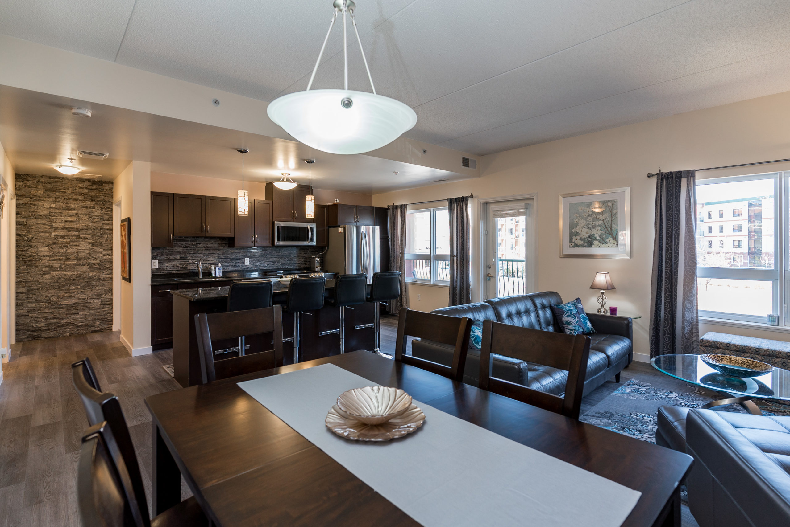 WOW FACTOR exhilarates the senses, upon entering – & there is so much to take in – & appreciate! Looking straight ahead, your eyes are thrust upon a balcony overlooking a beautiful piazza. Enjoy a glass of wine, or a good book in the summer & envision that you are in Rome. Beautiful architecture! Your eyes re-focus on this trendy & exciting 1076 sq ft “Masterpiece” featuring decor that could grace the cover of “Better Homes & Gardens” – one of two stone feature walls in the foyer, an open-concept design w/newer laminates, flowing through – complimenting the decor. Granite counters & stone backsplash, large island w/overhang & granite counter (rare/one piece), 4 SS APPLS, large windows allowing for an abundance of natural light, an exquisite LR & DR for soirées. A Primary suite w/walk-in CC & 4-PCE bath & 2nd 3-PCE & den. In-condo laundry (washer/dryer). Cent/air. The LARGEST 12 ft UNDERGROUND PARKING stall! VALUE – Utilities & MORE in condo fee. AMENITIES ABOUND!!