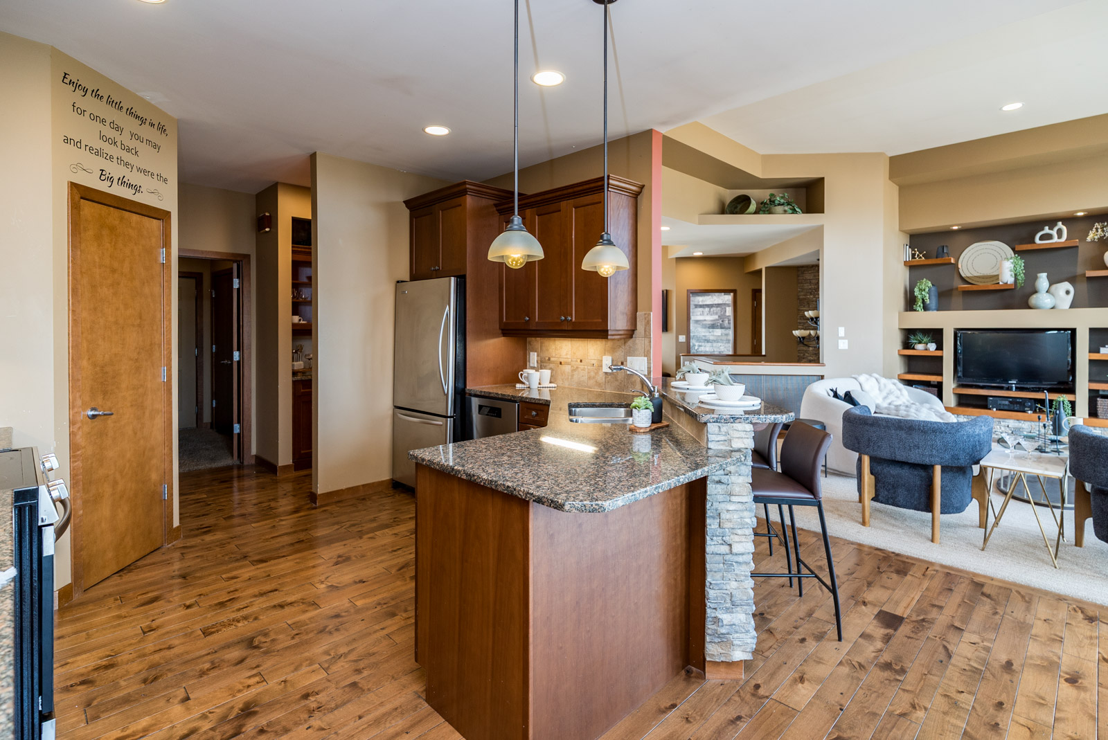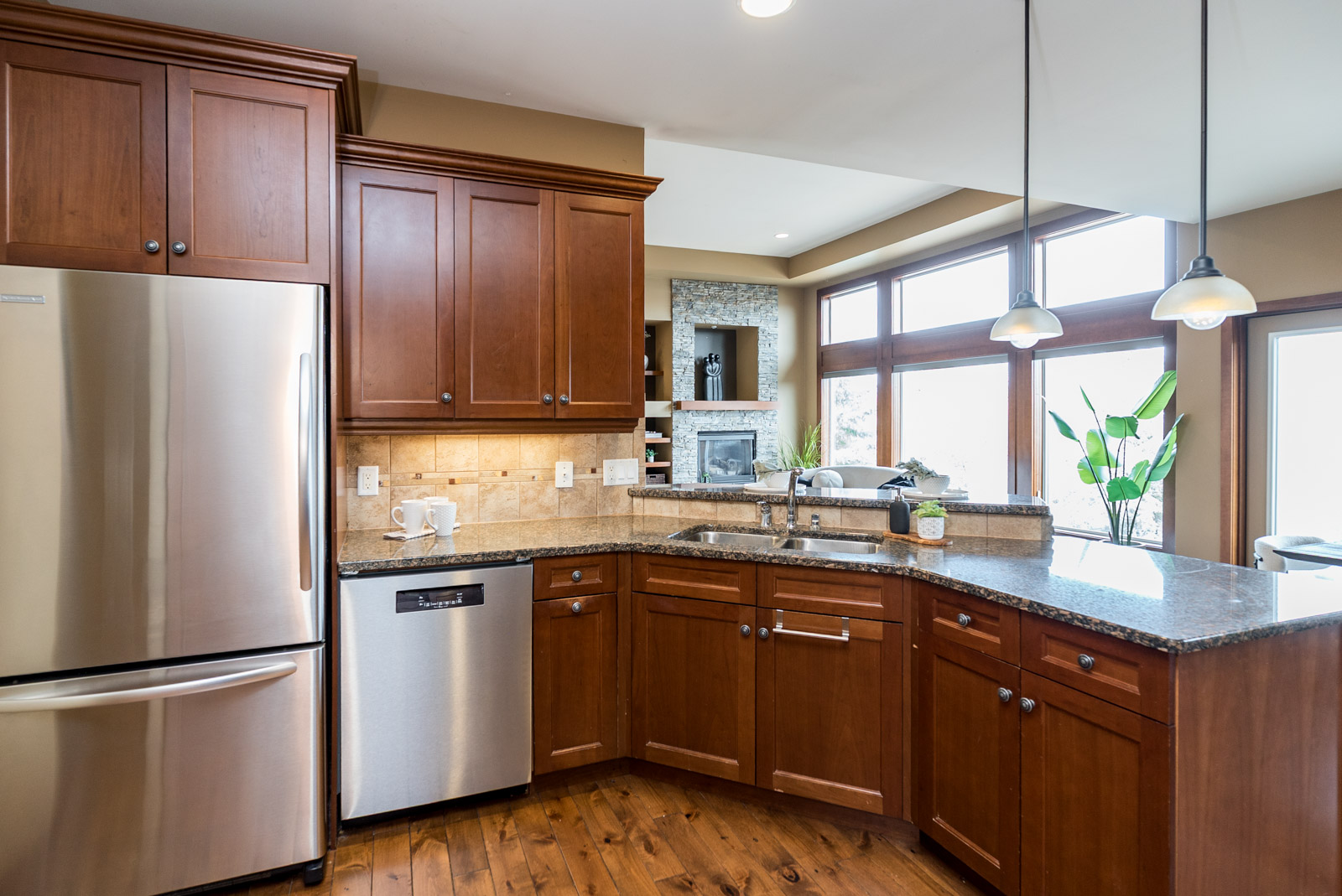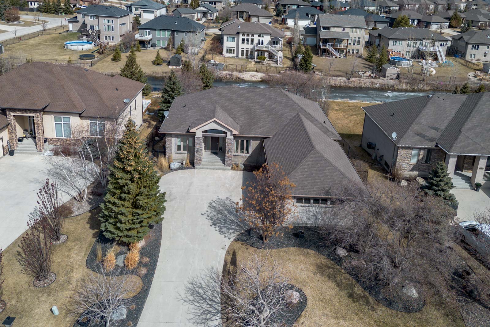 Welcome to this exquisite 2150 SQ ft walk out bungalow situated on a generous 79′ x 201′ lot, featuring an open concept layout and stunning creek views. This home boasts elegant hardwood floors, two gas fireplaces, and a beautiful kitchen with maple cabinets and granite countertops & walk in pantry. The main floor includes a primary bedroom with a 4-piece ensuite and walk-in closet, along with two additional bedrooms and a full bath. Enjoy the convenience of main floor laundry and a triple attached garage. The walkout basement offers a massive home theatre, rec room, fourth bedroom, and a 3-piece bath. The beautifully landscaped, fenced backyard includes a deck and patio, perfect for outdoor relaxation. Ideal for both comfort and entertaining, don’t miss out on this one!