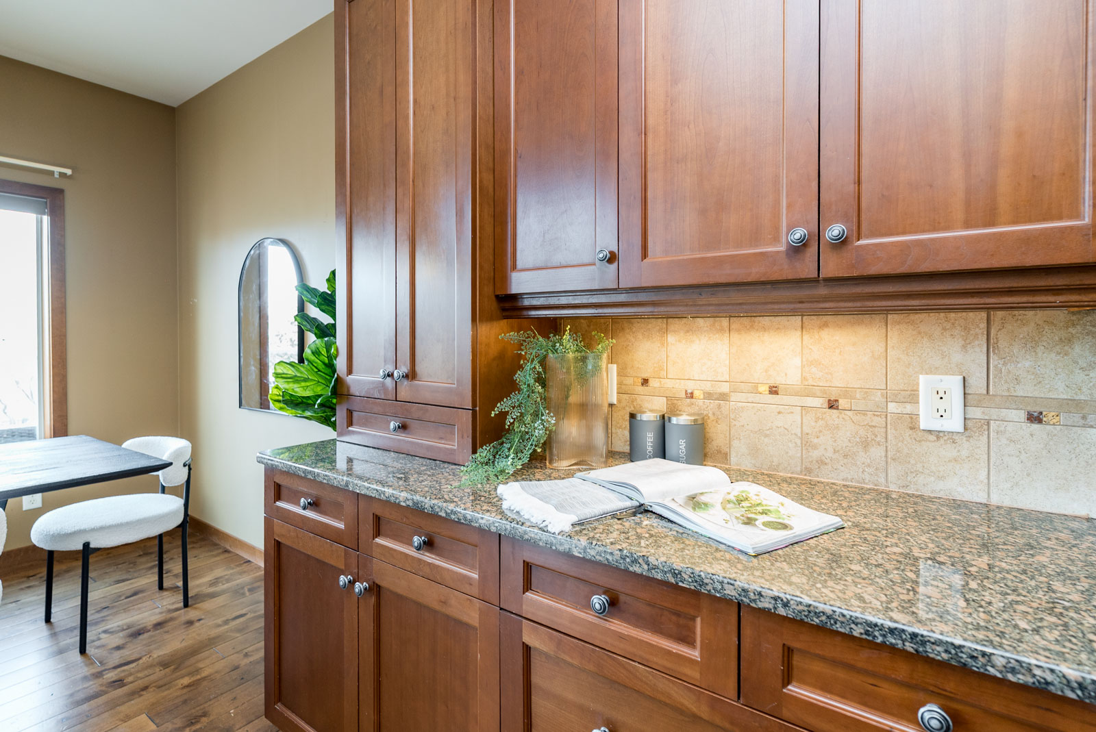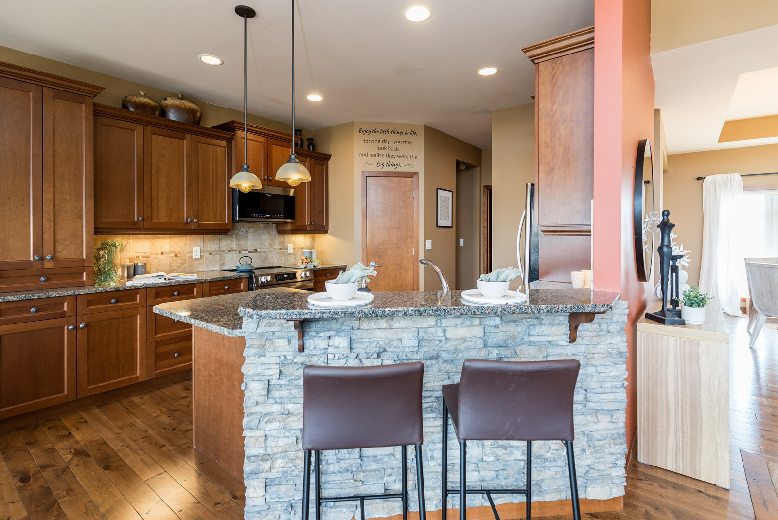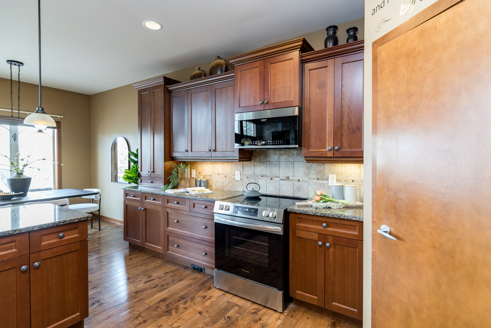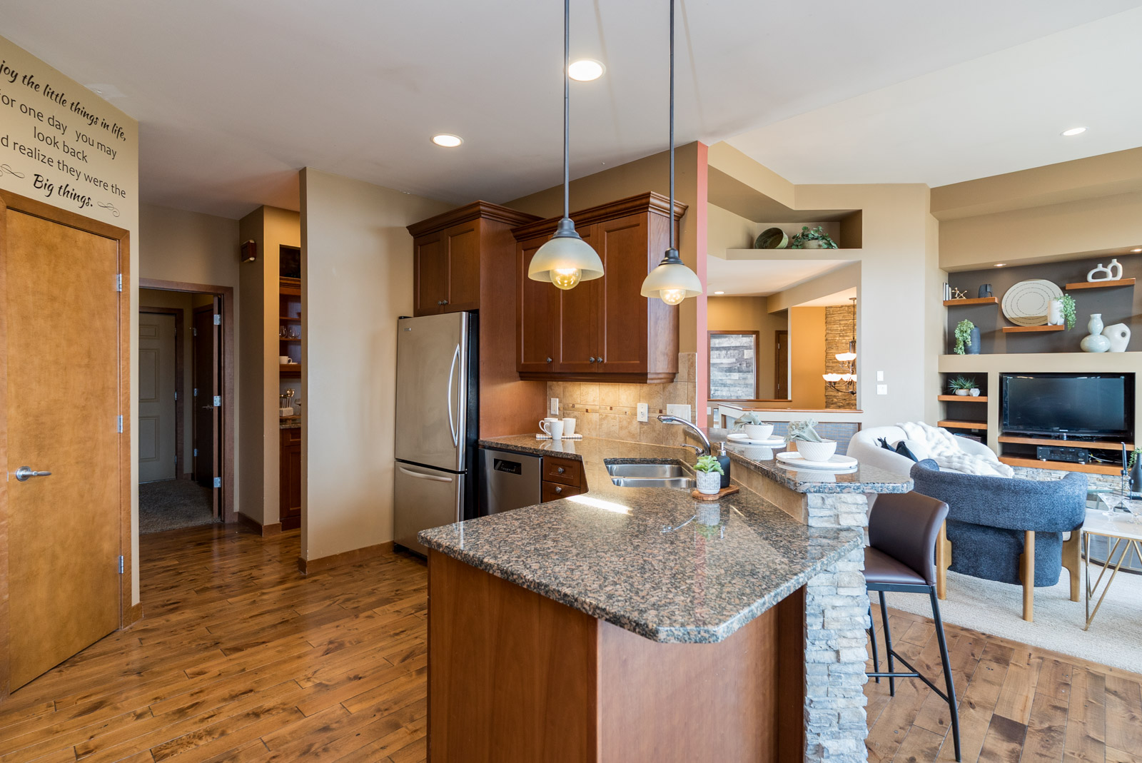 Welcome to this exquisite 2150 SQ ft walk out bungalow situated on a generous 79′ x 201′ lot, featuring an open concept layout and stunning creek views. This home boasts elegant hardwood floors, two gas fireplaces, and a beautiful kitchen with maple cabinets and granite countertops & walk in pantry. The main floor includes a primary bedroom with a 4-piece ensuite and walk-in closet, along with two additional bedrooms and a full bath. Enjoy the convenience of main floor laundry and a triple attached garage. The walkout basement offers a massive home theatre, rec room, fourth bedroom, and a 3-piece bath. The beautifully landscaped, fenced backyard includes a deck and patio, perfect for outdoor relaxation. Ideal for both comfort and entertaining, don’t miss out on this one!