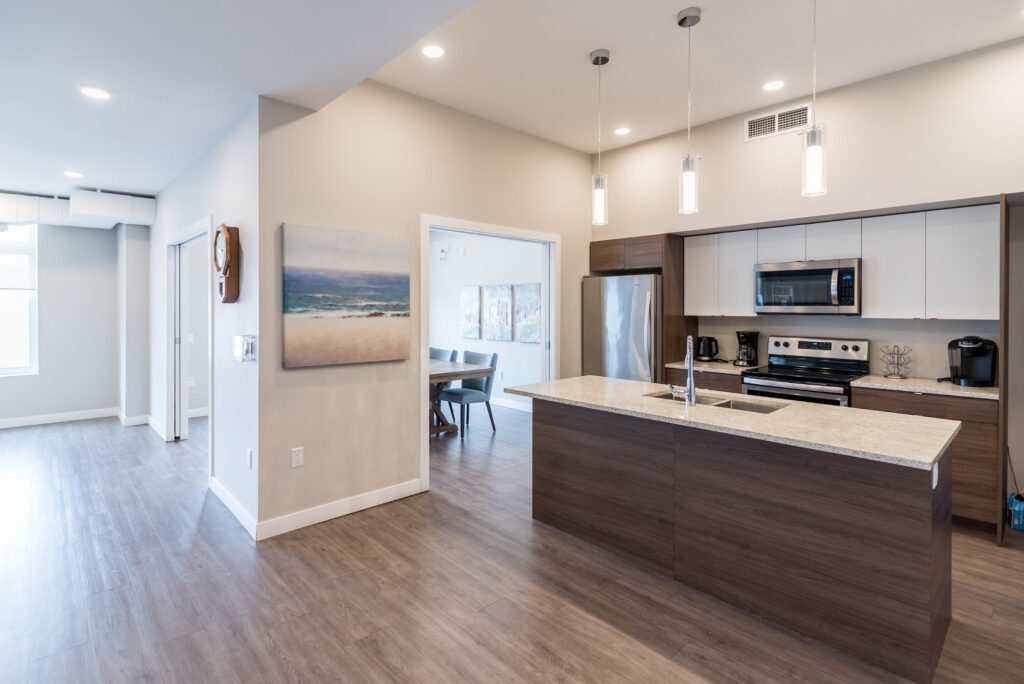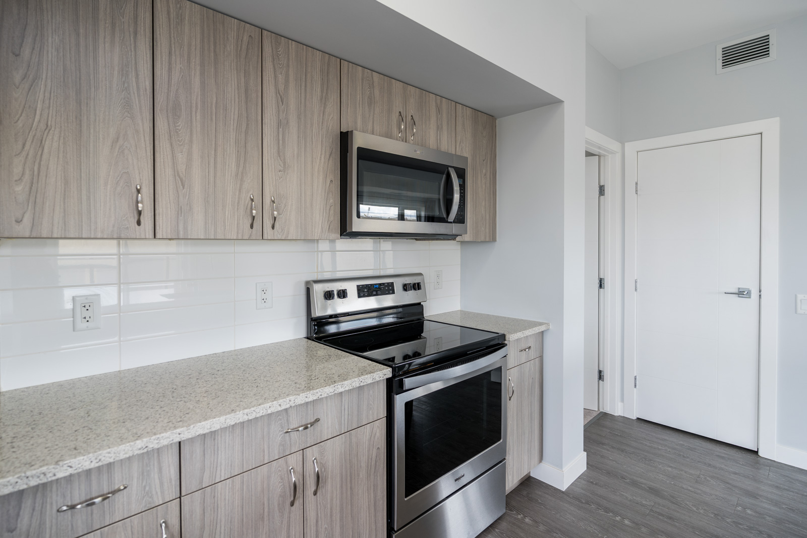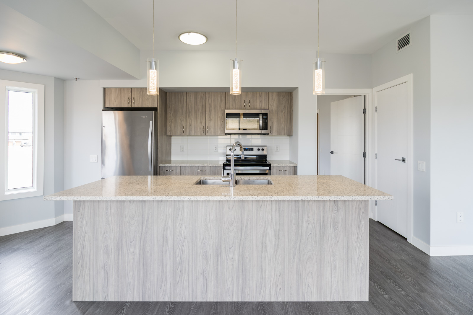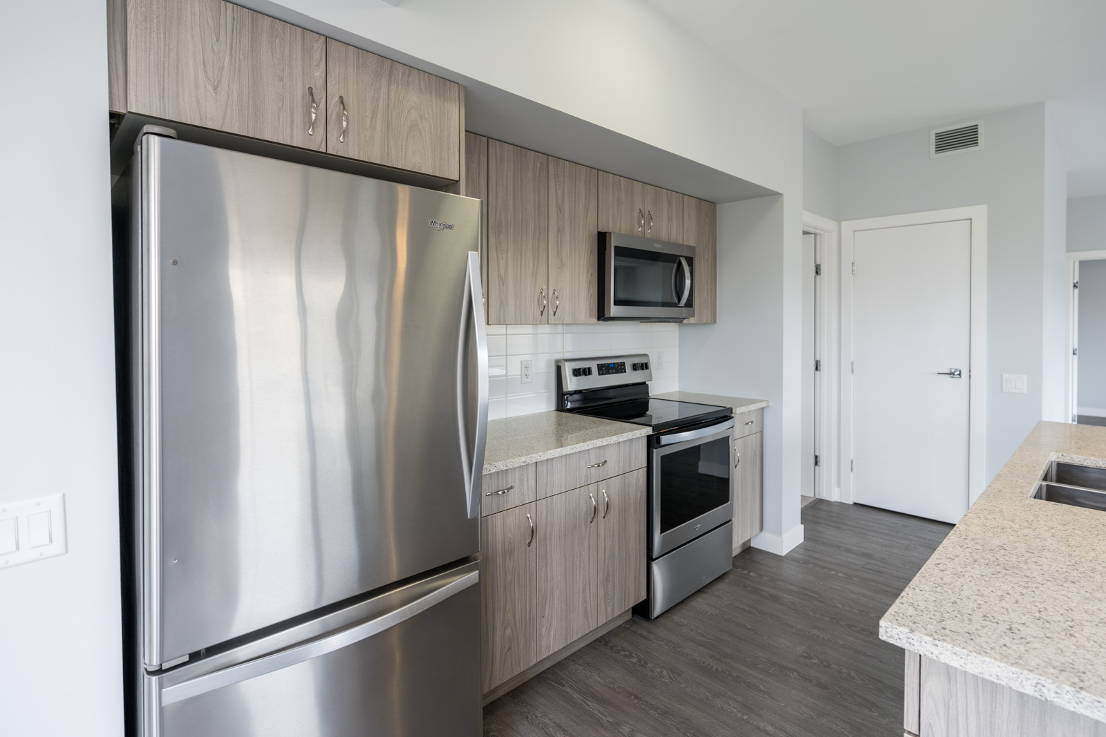 Welcome to Crocus Gardens! This bright and spacious 1,185 sq. ft. corner unit offers 2 bedrooms and 2 full bathrooms with a modern, open-concept layout designed for comfortable living and entertaining. The stylish kitchen features quartz countertops, upgraded KitchenAid stainless steel appliances, designer cabinetry, and a large walk-in pantry, flowing seamlessly into the generous dining and living areas with access to a private wrap around corner balcony. The primary suite includes a walk-in closet and 3-piece ensuite, while the second bedroom is ideally located near the 4-piece main bath. Enjoy the convenience of in-suite laundry and storage, along with modern laminate flooring. This unit includes one indoor parking stall. Crocus Gardens offers fantastic amenities including a clubhouse, party room, lounge, pool table, and fitness centre, all in a well-managed complex close to shopping and everyday conveniences. Largest layout in the project!