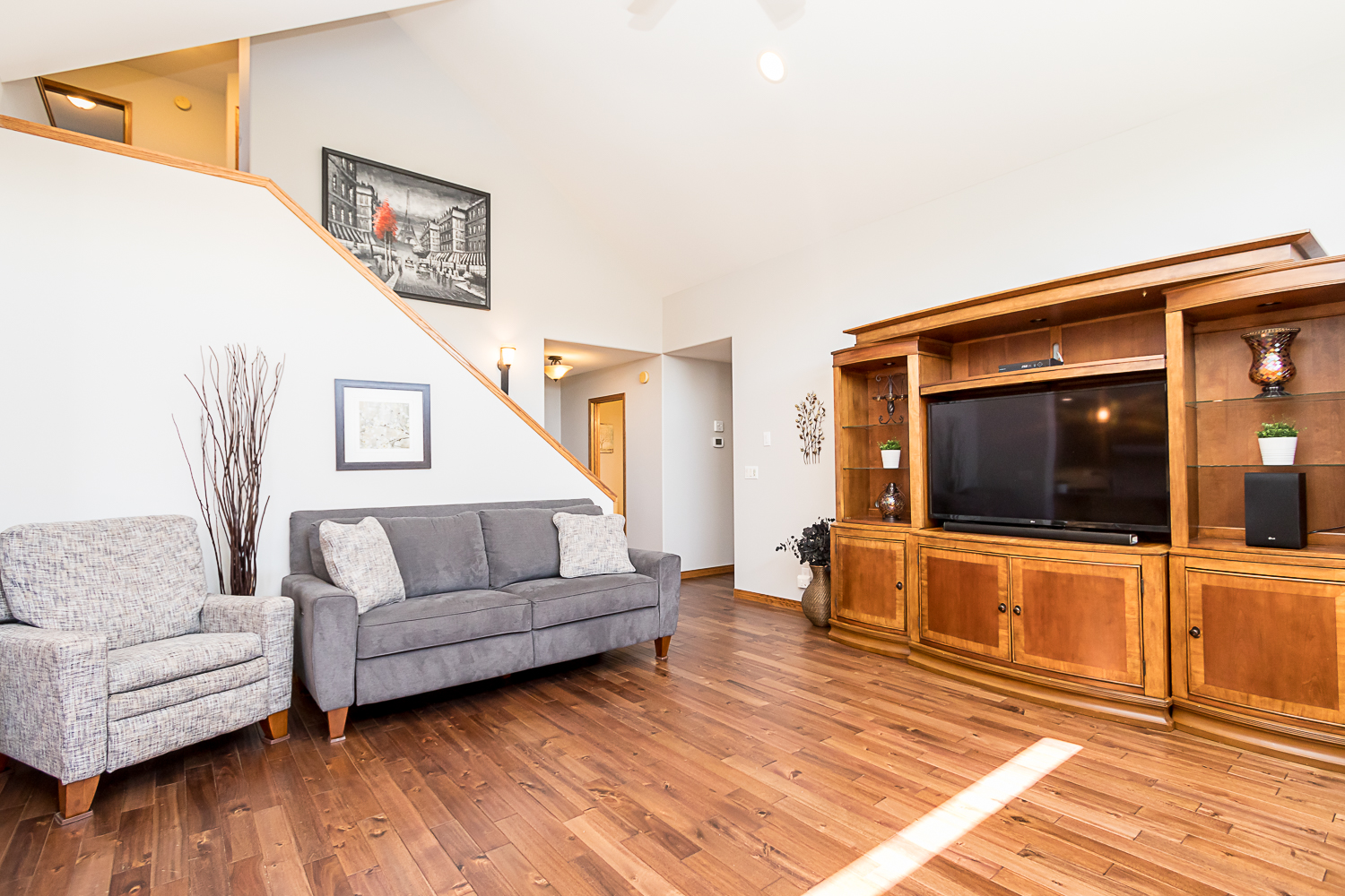 Welcome Home! This meticulously maintained custom built 1830 sq ft home is completely move in ready! As you enter the home you are greeted with soaring ceilings and gleaming hardwood flooring throughout the main living space. The open living room and kitchen offer plenty of natural light from the south facing windows, overlooking the large deck, above ground pool and huge fully fenced backyard (with underground sprinkler system, complete with remote!). The main floor also features a large master bedroom with beautiful updated five piece ensuite and huge walk-in closet, half bath just off the front door, and main floor laundry in the mud room off the double attached garage. Upstairs you will find two additional large bedrooms, another four piece bath and an extra loft area perfect for homework or TV/gaming. The basement is fully finished with a huge rec room and games/office area, an additional bedroom, three piece bathroom and loads of storage. Too many features to list!